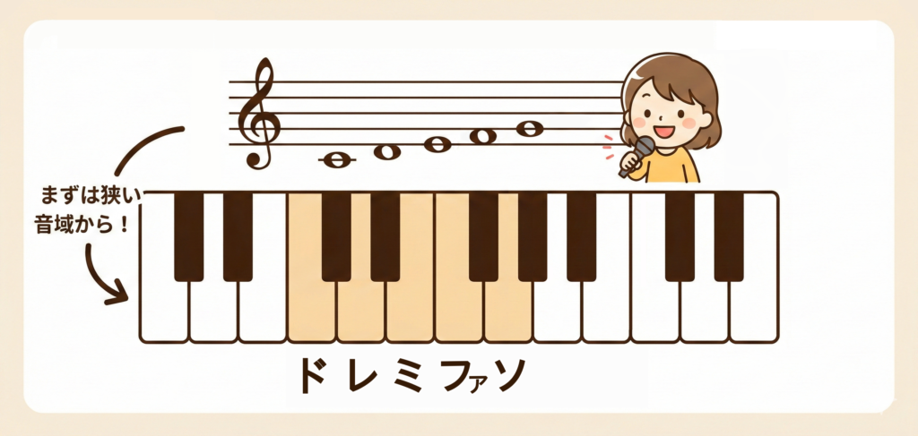 いきなり広い音域を練習するのではなく、まずは「ドレミファソ」のような5音程度の狭い音域(5音スケール)から始めましょう。