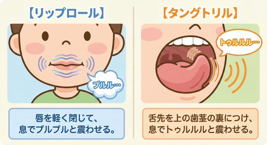 発声練習の最初のステップとして最適なのが「リップロール」と「タングトリル」です。
