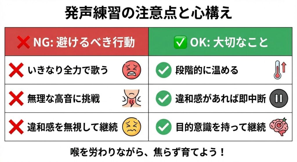 正しい順番で練習を重ねても、いくつかの「やってはいけないNG行動」をしてしまうと、効果が半減するどころか、大切な喉を痛めてしまう危険性があります。