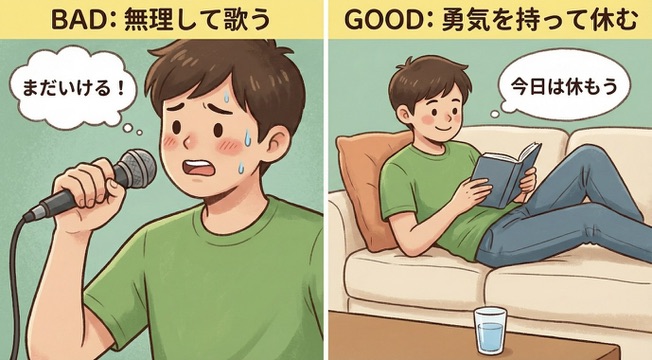 調子が悪い日は、声を出さない呼吸トレーニングやストレッチに切り替えるなど、賢明な判断が大切です。
