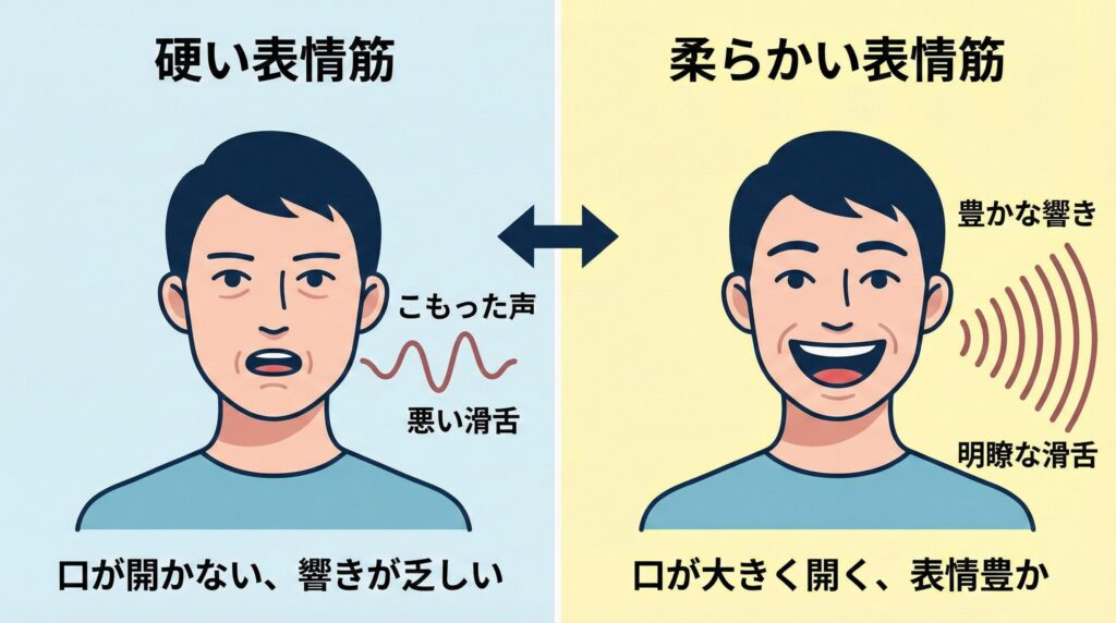 表情筋が硬いと、口の開きが小さくなって声がこもったり、滑舌が悪くなったりする原因になります。