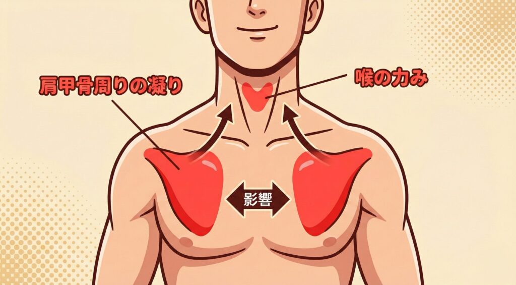 特に、肩甲骨周りには声帯の動きにも影響を与える筋肉が集中しており、この部分が凝り固まっていると無意識のうちに喉が力んでしまいます。