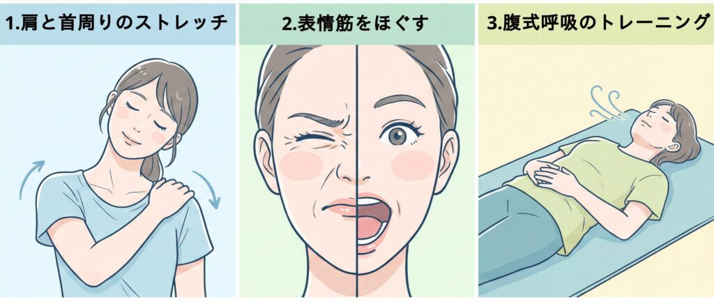 まずは肩・首周りのストレッチと表情筋の解放、そして腹式呼吸で「体を歌うための楽器」として整えます。