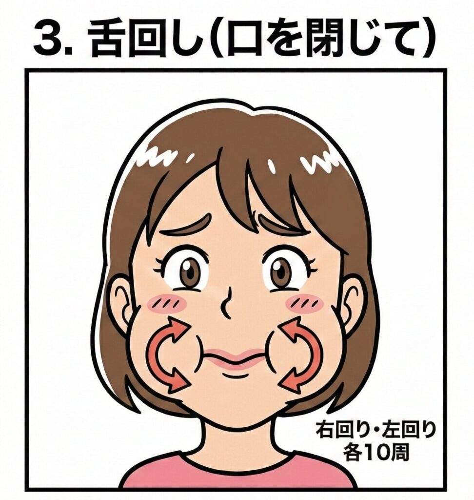 さらに、口を閉じたまま、舌で歯茎の外側をなぞるように、右回り・左回りとゆっくり大きく10周ずつ回す「舌回し」も効果的です。