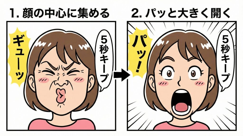 鏡を見ながら、自分の表情がどれだけ動くか確認しながら行うと、より効果を高めることができるでしょう。