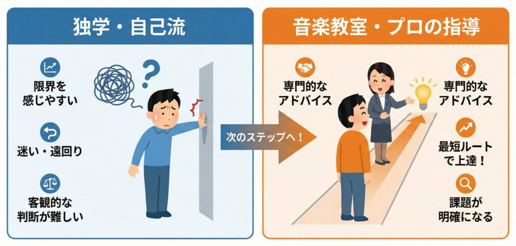 そして、もし一人での練習に限界を感じたり、より専門的なアドバイスが欲しくなったら、音楽教室の体験レッスンなどを活用してみるのも良いでしょう。